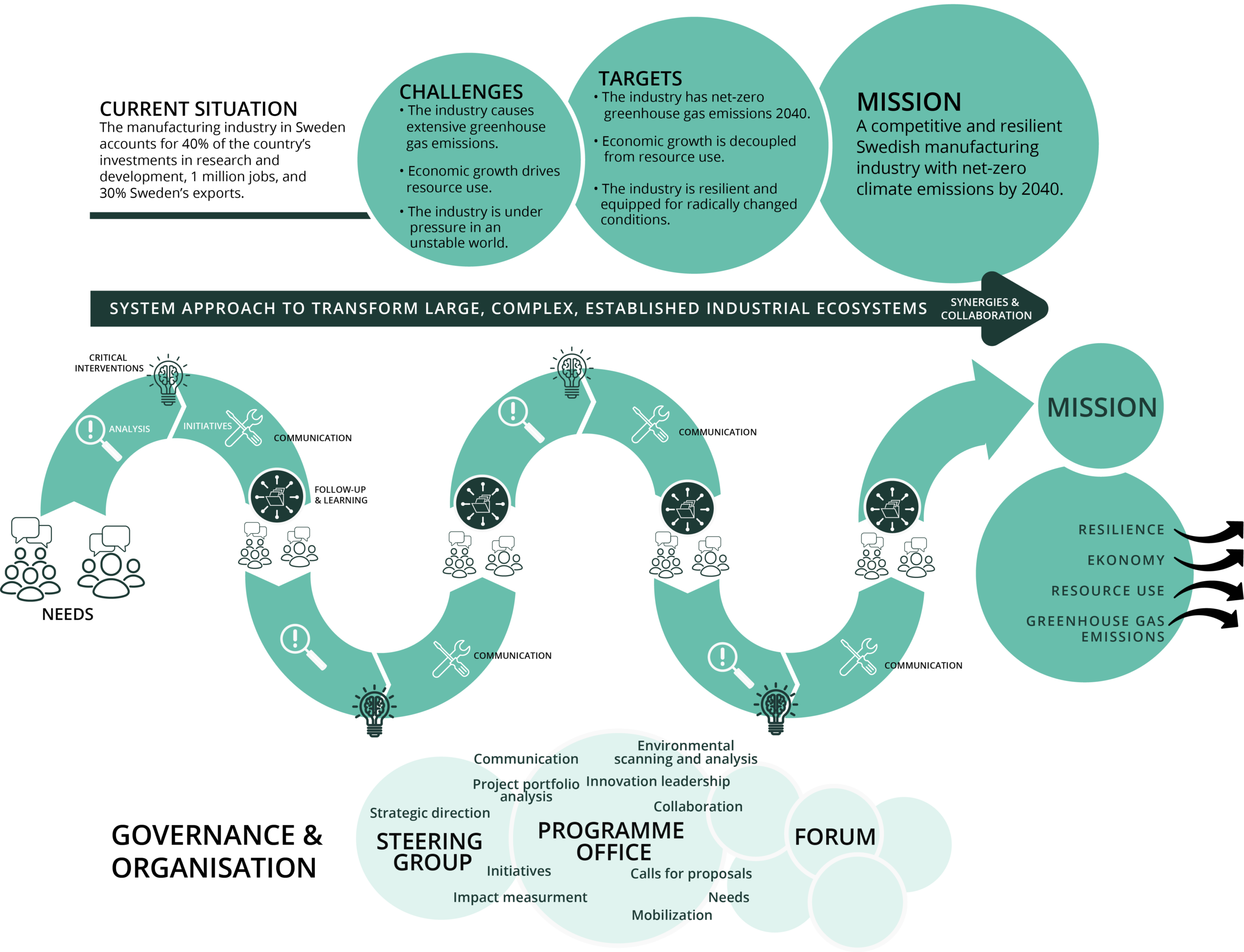 The illustration above is Net Zero Industry’s first version, and it will be continuously developed throughout the programme’s lifetime. Our basic approach is that continuous analysis of the system and the surrounding world is required, together with a broad range of initiatives that are developed over time.