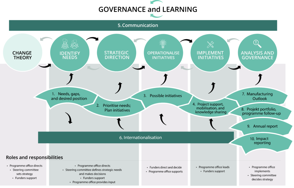 The illustration shows how the programme identifies needs, gaps and desired effects through dialogue forums, a broad Net Zero forum and an industrial strategy council. The programme’s steering group then prioritises and guides the direction through action plans and needs assessments that are submitted to the financiers. In the final step, the financiers use the needs assessment to form the most appropriate initiatives that make a difference through an innovative initiative portfolio. Continuous monitoring and control of outcomes are crucial to ensure that the programme is accurately targeted.